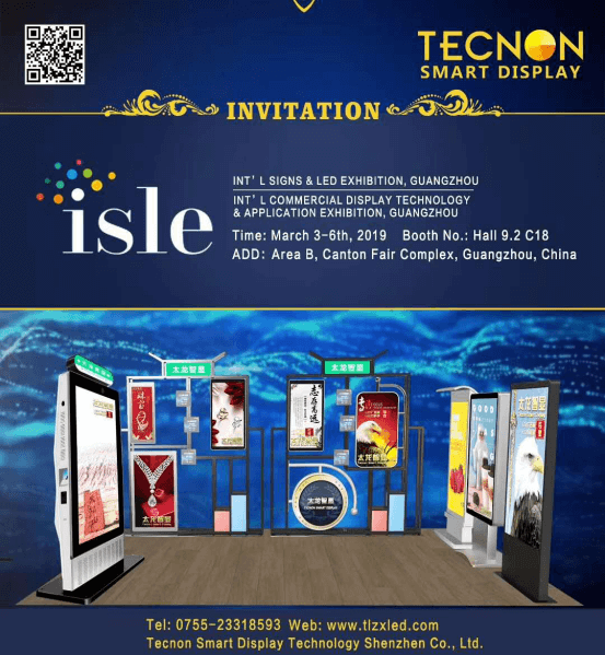 2019年3月3日,由广州交易会广告有限公司及中国对外贸易广州展览总公司联合主办的广州ISLE展即将隆重开幕,而此次展会太龙智显也是做了精心的准备,披上全新战袍,华丽亮相,带来了更为优质的LED广告机和LED灯杆屏产品、更热情的现场产品解说和更有创意的展位设计,与您一起畅谈智慧2019。