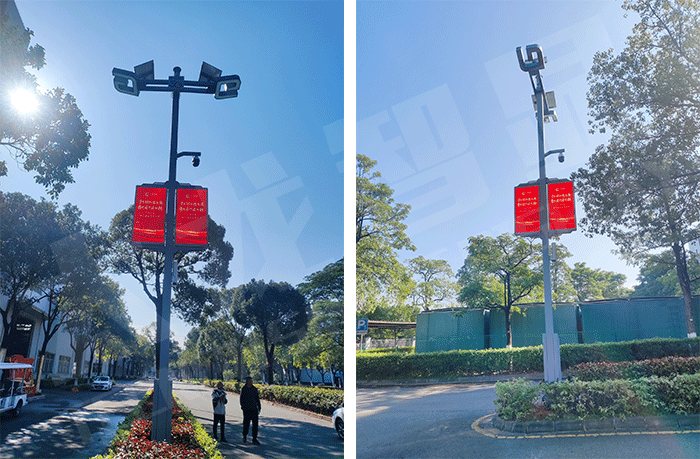 此次项目位于广州广日电气工业园与江南西商业街展开。从现场的图片可以看出智慧路灯搭配LED灯杆屏同步使用。LED灯杆屏作为智慧路灯强有力的帮手,拥有远程发布、语音喊话、远程监控、智能温控、多屏同步等功能,大大的提高了管理效率,能有效的降低人工操作成本。